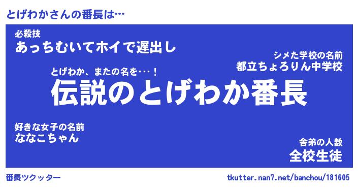 | ピコ太郎風あだ名 | 『トコ次郎』『ピト次郎』『トゲ三郎』 |
