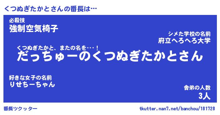 | 肩書あだ名 | 『くつぬぎたかと店長』 |