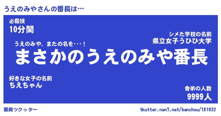 | 肩書あだ名 | 『うえのみや社長』『うえのみや総理大臣』 |