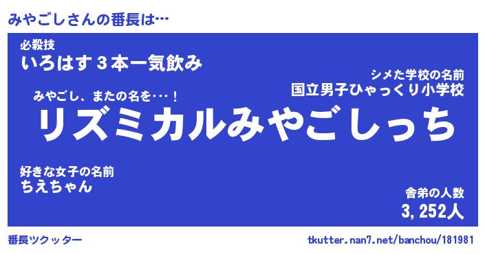 | ピコ太郎風あだ名 | 『ミコ十郎』『ピミ三郎』『ミヤ史郎』 |