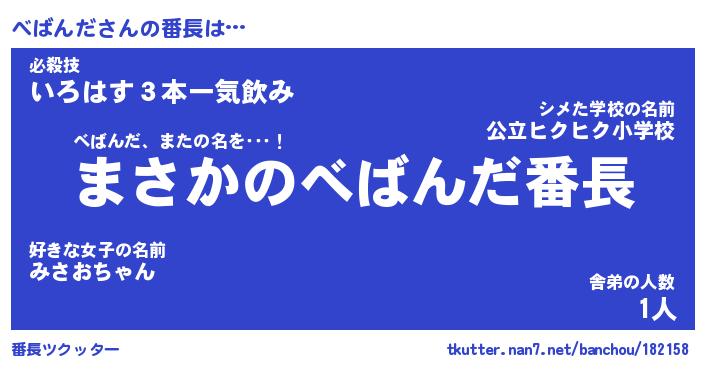 | 意味不明あだ名 | 『ペロリンべばんだ』『永久保存べばんだ』 |
