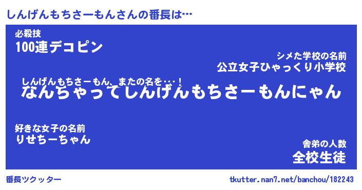 | 男性向けラノベタイトル風あだ名 | 『しんげんもちさーもんの憂鬱』 |