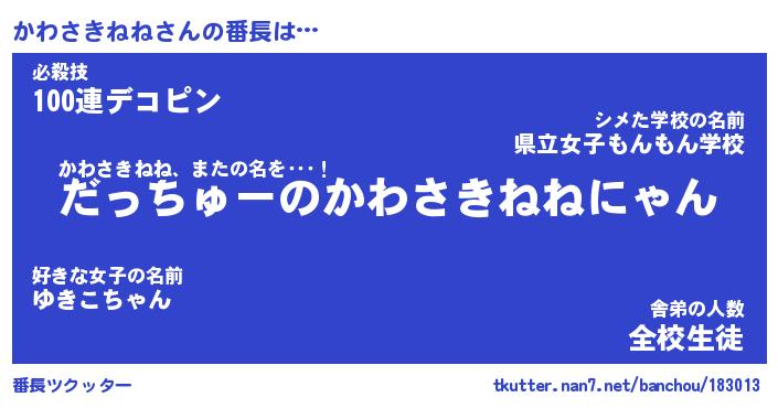 | ヒーロー風カッコイイあだ名 | 『スーパーカワサキネネ』『炎刃騎士カワ』 |
