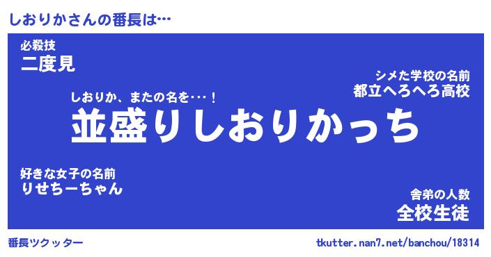 | 意味不明あだ名 | 『ペロリンしおりか』『永久保存しおりか』 |