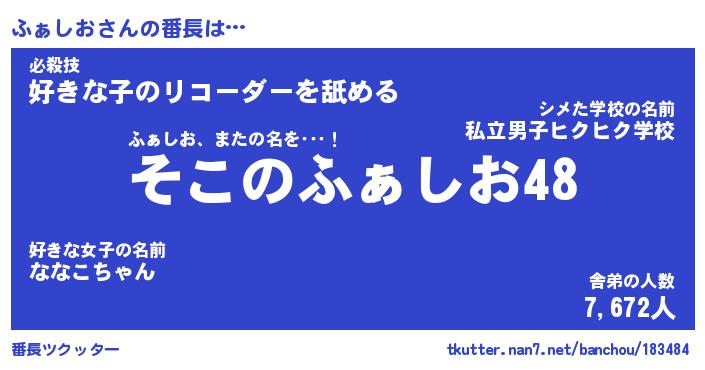 | 意味不明あだ名 | 『ペロリンふぁしお』『永久保存ふぁしお』 |
