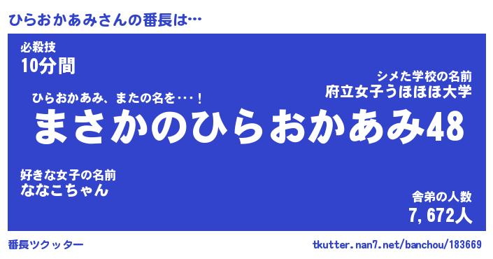 | 恥ずかしいあだ名 | 『プリティーひらおかあみ』『ひらっちょ』 |