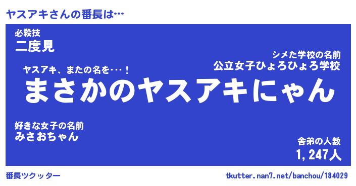 | ヒーロー風カッコイイあだ名 | 『スーパーヤスアキ』『炎刃騎士ヤス』 |