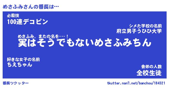 | 意味不明あだ名 | 『ペロリンめさふみ』『永久保存めさふみ』 |