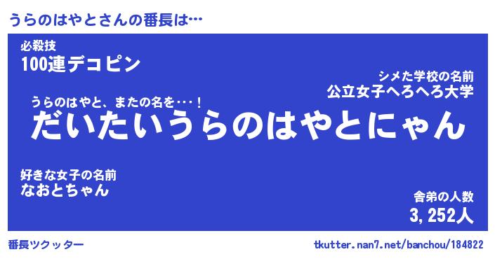 | 肩書あだ名 | 『うらのはやと店長』『うらのはやと団長』 |