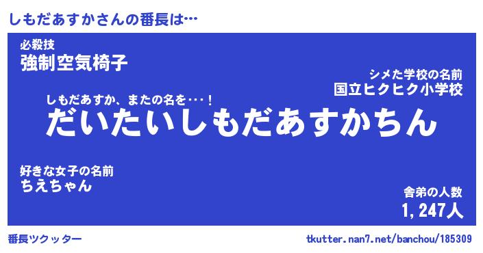| ヒーロー風カッコイイあだ名 | 『スーパーシモダアスカ』『銀牙騎士シモ』 |