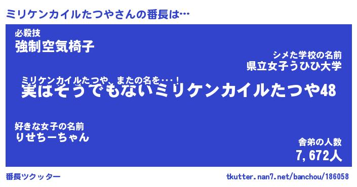 | 男性向けラノベタイトル風あだ名 | 『ミリケンカイルタツヤアートオンライン』 |