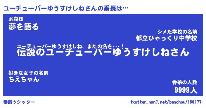 | 伝説のあだ名 | 『伝説の竜騎士ユーチューバーゆうすけしね』 |