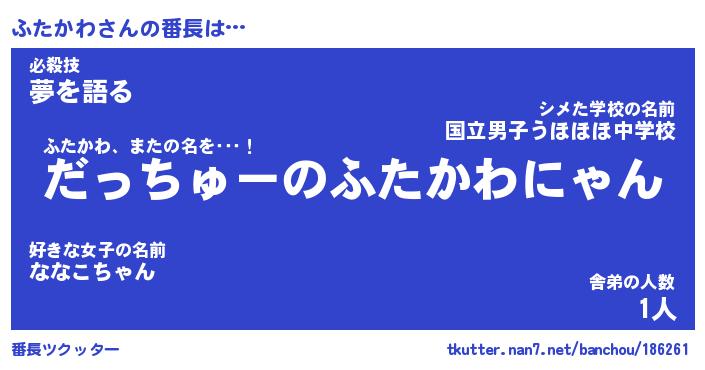| 意味不明あだ名 | 『ペロリンふたかわ』『永久保存ふたかわ』 |
