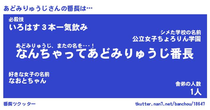 | 男性向けラノベタイトル風あだ名 | 『あどみりゅうじの憂鬱』 |