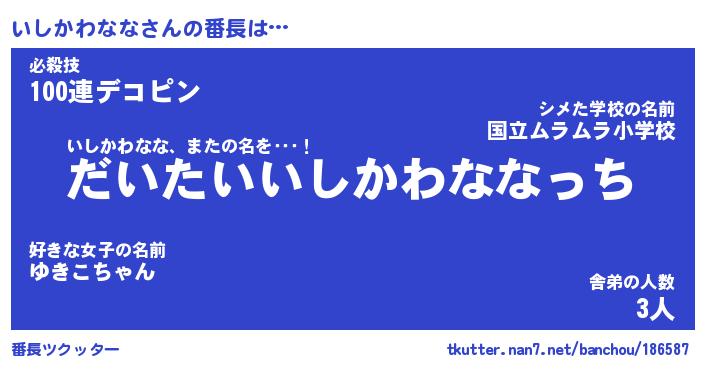 | ヒーロー風カッコイイあだ名 | 『スーパーイシカワナナ』『黄金騎士イシ』 |