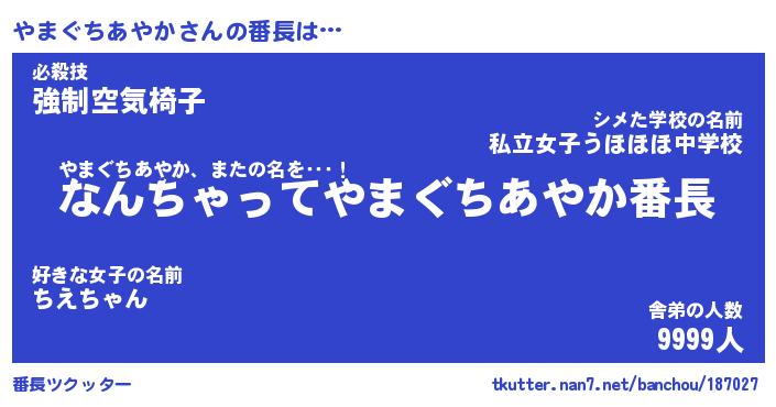 | 伝説のあだ名 | 『伝説のスナイパーやまぐちあやか』 |