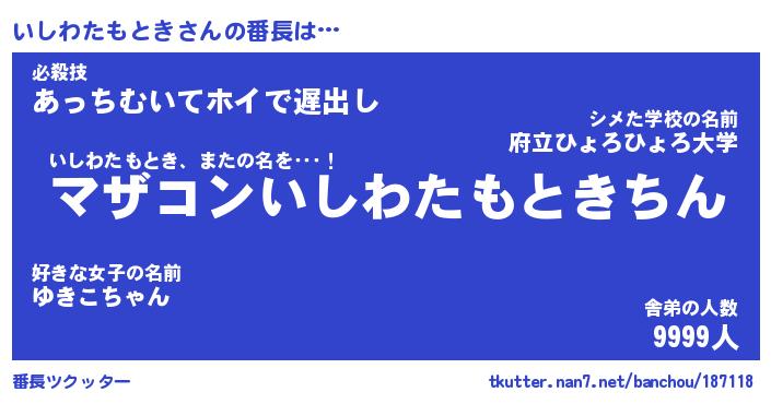 | 恥ずかしいあだ名 | 『プリティーいしわたもとき』『いしちん』 |