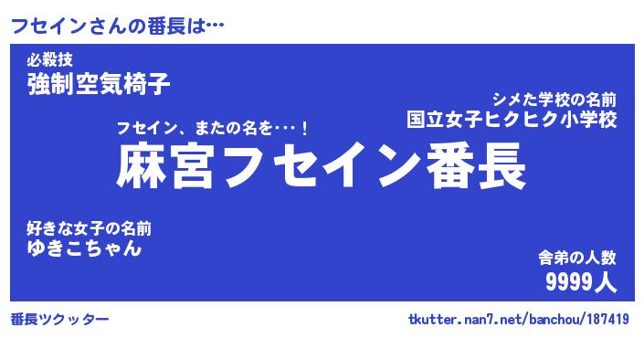 | 意味不明あだ名 | 『ペロリンフセイン』『永久保存フセイン』 |