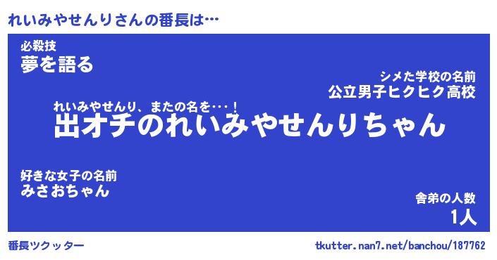 | 伝説のあだ名 | 『伝説のスナイパーれいみやせんり』 |