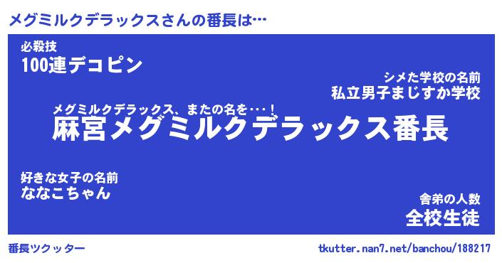 | 伝説のあだ名 | 『不死鳥のスナイパーメグミルクデラックス』 |