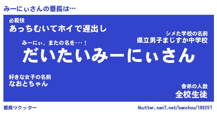 | 意味不明あだ名 | 『ペロリンみーにぃ』『永久保存みーにぃ』 |