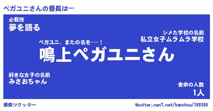 | 意味不明あだ名 | 『ペロリンペガユニ』『永久保存ペガユニ』 |