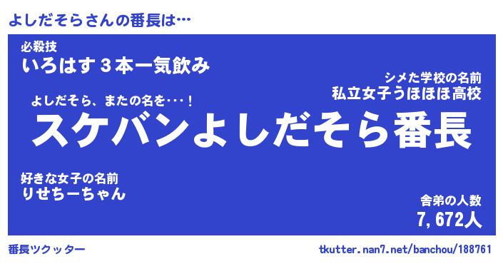 | 肩書あだ名 | 『よしだそら店長』『よしだそら総理大臣』 |