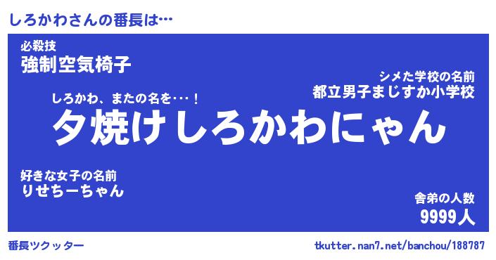 | 意味不明あだ名 | 『ペロリンしろかわ』『永久保存しろかわ』 |