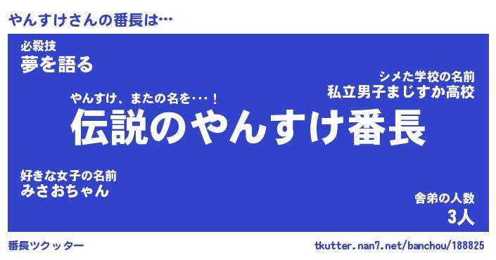 | 意味不明あだ名 | 『ペロリンやんすけ』『永久保存やんすけ』 |