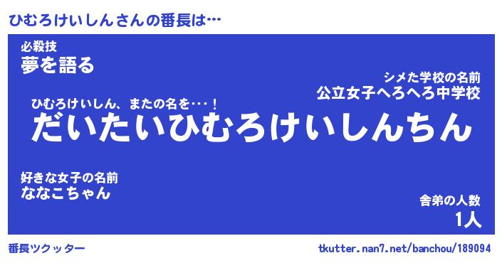 | 男性向けラノベタイトル風あだ名 | 『ひむろけいしんの憂鬱』 |