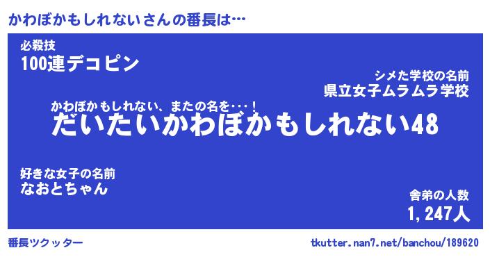 | 男性向けラノベタイトル風あだ名 | 『かわぼかもしれないの憂鬱』 |
