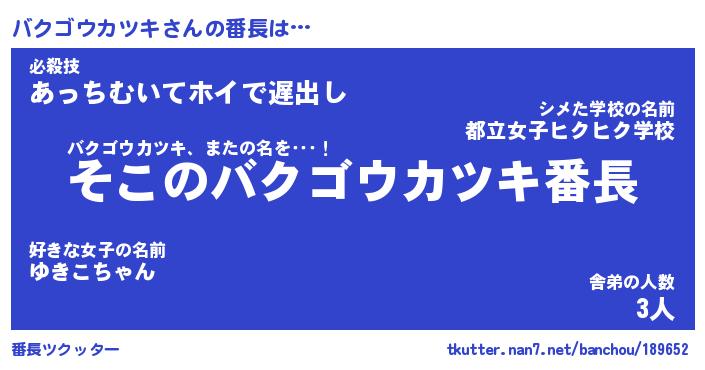| 男性向けラノベタイトル風あだ名 | 『バクゴウカツキの憂鬱』 |
