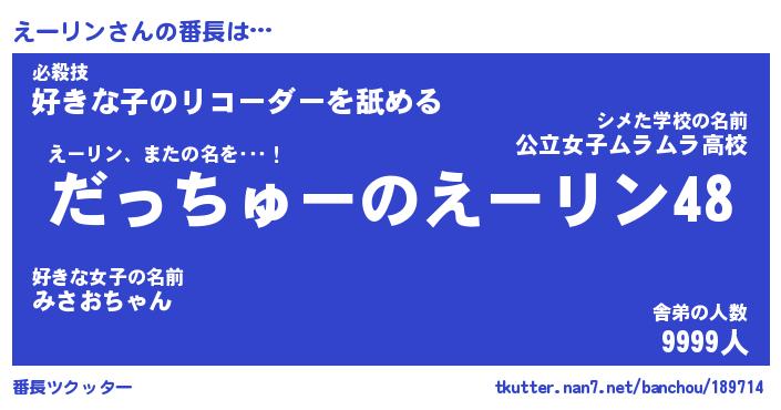 | 意味不明あだ名 | 『ペロリンえーリン』『永久保存えーリン』 |