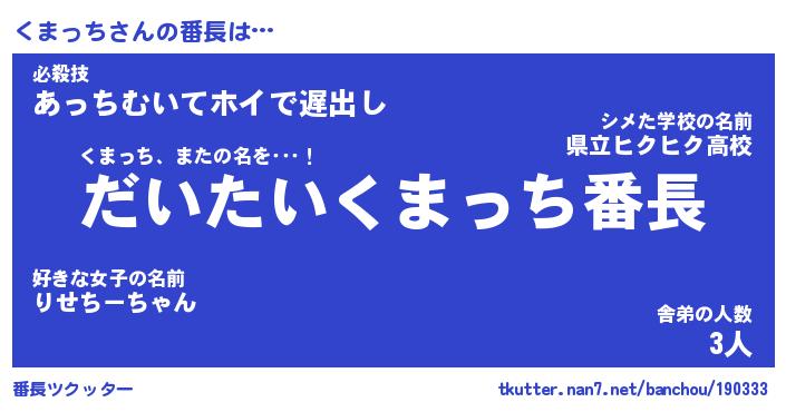 | ヒーロー風カッコイイあだ名 | 『スーパークマッチ』『魔戒騎士クマ』 |