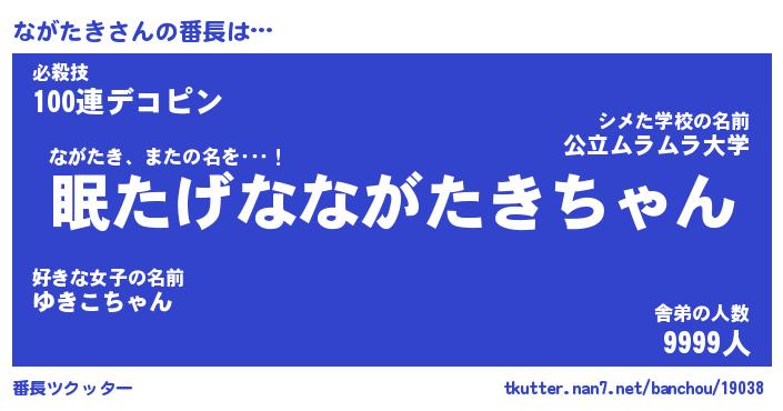 | 意味不明あだ名 | 『ペロリンながたき』『永久保存ながたき』 |