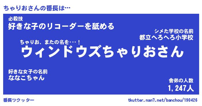 | 肩書あだ名 | 『ちゃりお御曹司』『ちゃりお国家主席』 |