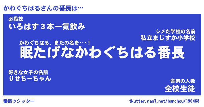 | 伝説のあだ名 | 『封印されしスナイパーかわぐちはる』 |
