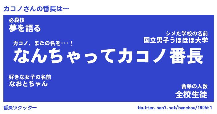| 肩書あだ名 | 『カコノ店長』『カコノ総理大臣』 |