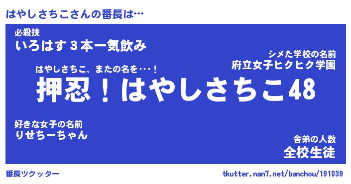 | 肩書あだ名 | 『はやしさちこ店長』『はやしさちこ団長』 |