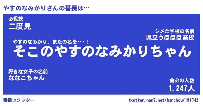 | 男性向けラノベタイトル風あだ名 | 『やすのなみかりの憂鬱』 |