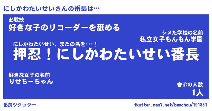 | 肩書あだ名 | 『にしかわたいせい店長』 |