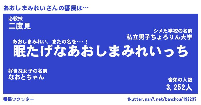 | 伝説のあだ名 | 『封印されしスナイパーあおしまみれい』 |