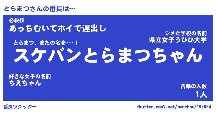 | 意味不明あだ名 | 『ペロリンとらまつ』『永久保存とらまつ』 |