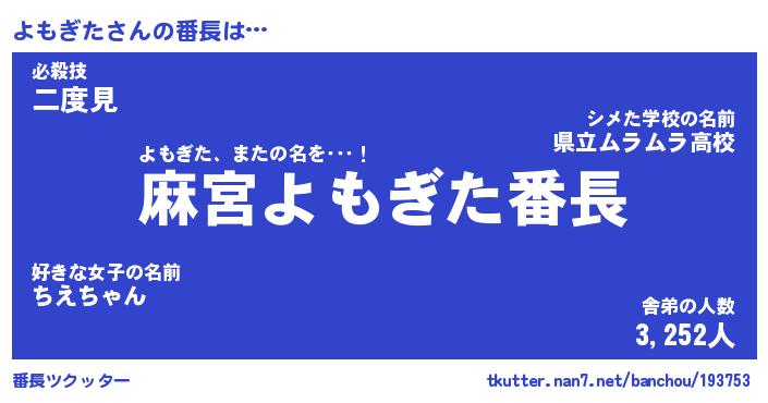 | 意味不明あだ名 | 『ペロリンよもぎた』『永久保存よもぎた』 |