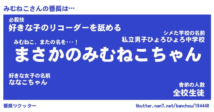 | 意味不明あだ名 | 『ペロリンみむねこ』『永久保存みむねこ』 |