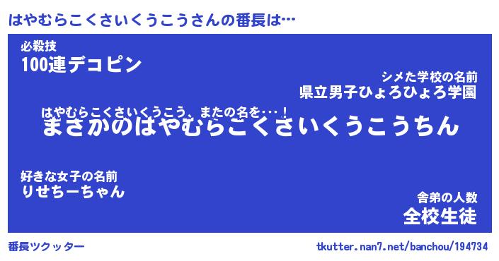 | ヒーロー風カッコイイあだ名 | 『スーパーハヤムラコクサイクウコウ』 |