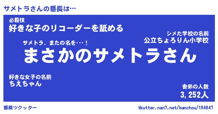 | 意味不明あだ名 | 『ペロリンサメトラ』『永久保存サメトラ』 |
