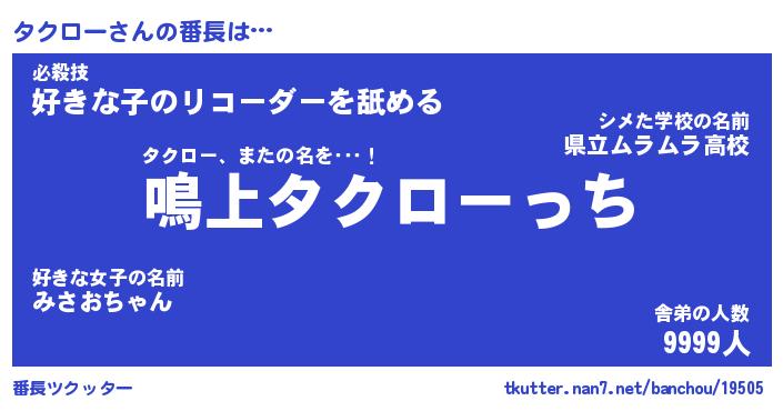 | 肩書あだ名 | 『タクロー社長』『タクロー総理大臣』 |