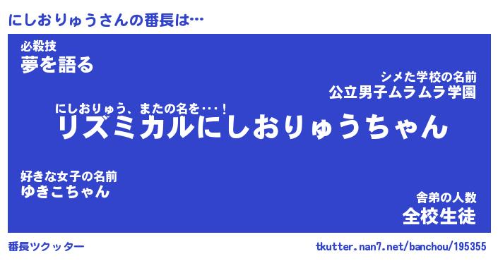 | 男性向けラノベタイトル風あだ名 | 『にしおりゅうの憂鬱』 |