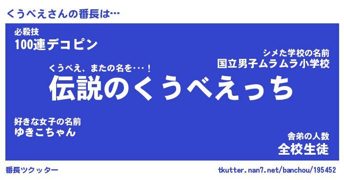 | 意味不明あだ名 | 『ペロリンくうべえ』『永久保存くうべえ』 |